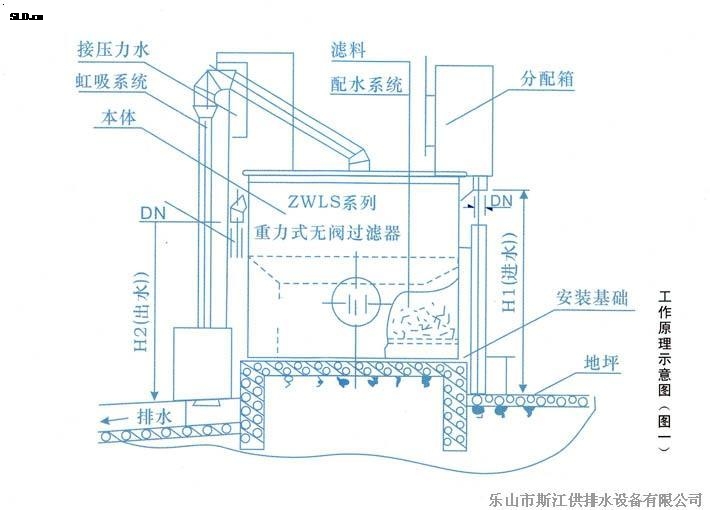 原水不斷自進(jìn)水管進(jìn)入虹吸上升管在輔助虹吸管的管口處,進(jìn)入輔助虹吸管并沿該管下跌,在下跌過程中通過“抽氣三通”,并帶走“抽氣三通”側(cè)管內(nèi)的空氣,而“抽氣三通”側(cè)管是連接虹吸管系統(tǒng)倒置U型管頂部的,這樣,“抽氣三通”就抽吸了虹吸管系統(tǒng)倒置U型管頂部和虹吸下降管內(nèi)的空氣,由于虹吸下降管的下部管口在排水水封內(nèi)被水封住管口,于是倒置U型管頂部及虹吸下降管內(nèi)逐漸形成負(fù)壓,并且真空度逐漸增大,水封內(nèi)的水在虹吸下降管的液面從“反沖洗前,管內(nèi)最低水位”迅速上升,并越過倒置U型管頂部,與虹吸上升管內(nèi)的原水匯合,形成虹吸,原水沿虹吸下降管下跌,于是反沖洗開始了,清水自清水區(qū)沿?cái)?shù)條連通管,清水管由上而下進(jìn)入集水區(qū),從集水區(qū)通過網(wǎng)板、承托層,自下而上反沖濾料,使濾層處于膨脹,濾料相互摩擦、碰撞狀態(tài),被截留和吸附在濾料層內(nèi)的懸浮物等污物隨水流通過渾水區(qū),進(jìn)入虹吸管系,沿虹吸上升管,虹吸下降管進(jìn)入排水水封井,流至下水管網(wǎng)。在反沖洗過程中,清水區(qū)內(nèi)的水面迅速下降,同一體相隔的另一室的清水,進(jìn)入正在反沖洗的一室內(nèi),參與反沖洗,以保證足夠的沖洗時(shí)間。當(dāng)清水區(qū)內(nèi)的水面降至虹吸破壞斗管口時(shí),空氣自虹吸破壞斗的管口進(jìn)入倒置U型虹吸管系的頂部,于是虹吸被破壞,虹吸管系內(nèi)的反沖洗水?dāng)嗔鳎礇_洗結(jié)束。同時(shí),處于膨脹狀態(tài)的濾料層的濾料下落,原水仍進(jìn)入渾水區(qū),經(jīng)濾料層,開始了又一個(gè)周期的過濾。如此周而復(fù)始地過濾,反沖洗,過濾……
